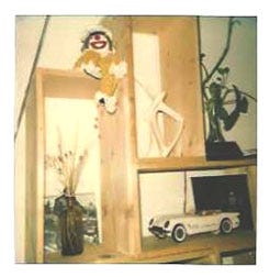 The next photo is of one bedroom in the two-bedroom apartment. I used 1X12 pine boards to cut and assemble 1 foot by two-foot boxes I could stack vertically and horizontally along one wall of the bedroom. I don’t know where the clown came from, nor do I remember the other items except for the model 1953 Corvette, which I still keep in my office. The boxes accommodated all I needed, including a tiny TV.