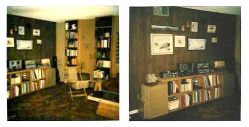 Some artwork I'd collected over the years hung on the wall above the stereo. The right-side wall has two simple, floor-to-ceiling bookcases and between them and to each side are 2 feet by 8-foot particle board panels with 1 inch by 4-inch edges. Altogether, it formed a wall for books and decorations. Everything remained unfinished for many years.